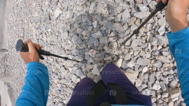 Вид от первого лица на ноги мужчины в синих ботинках и брюках, идущего по скалистому склону в горах. Турист держит в руках трекинговые палки. Эпическое восхождение по рыхлым скалам и камням в горах