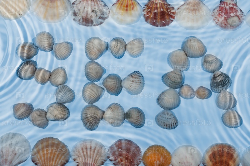Слово 'море', сделанное из раковин под водой, в качестве фона