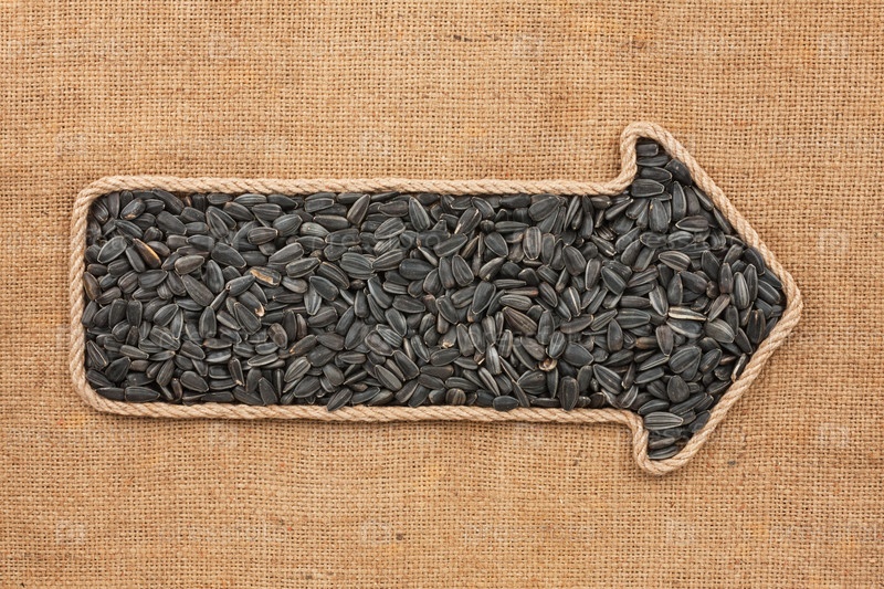 Показатель, сделанный из веревки с семенами подсолнечника, лежащими на мешке, с местом для вашего текста. . Pointer made from rope with sunflower seeds lying on sackcloth