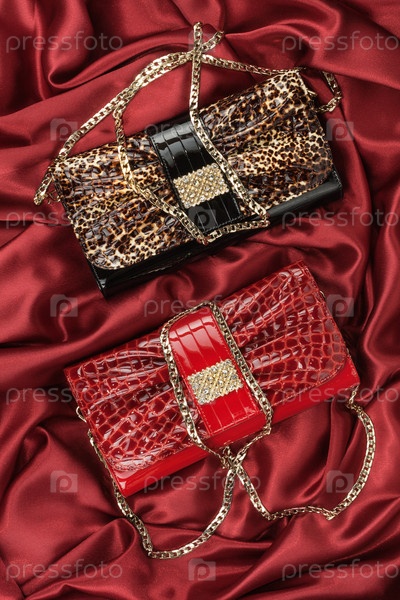 Красная и леопардовая сумка, лежащая на красной ткани, может использоваться в качестве фона