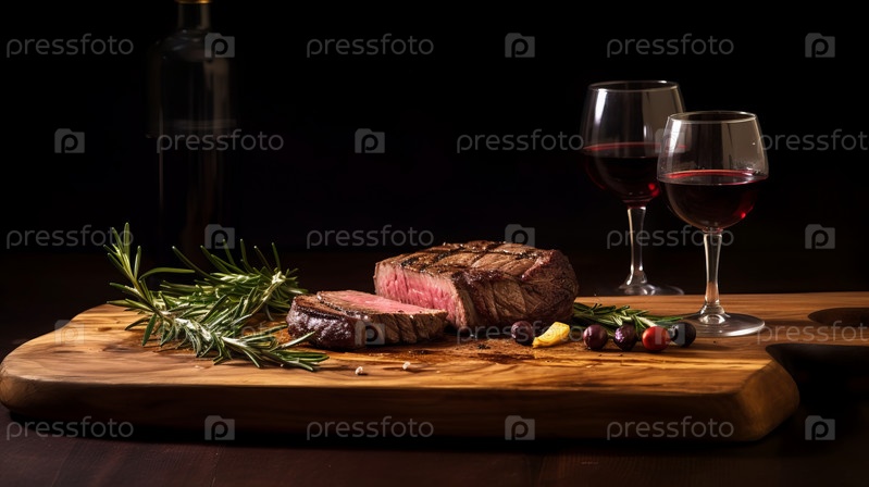 Стейк с красным вином на фоне стола