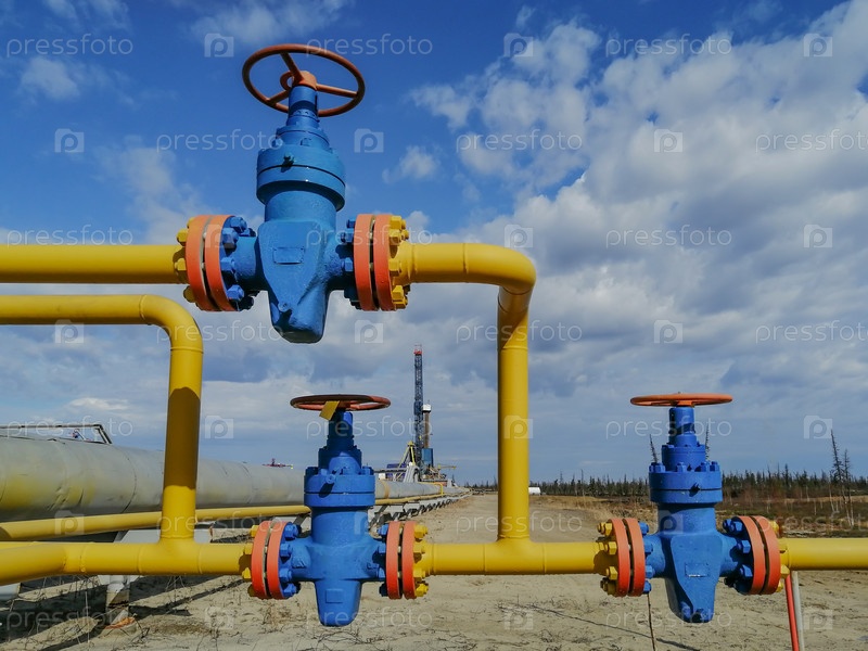 Трубопроводная арматура и манифольд добывающих газовых скважин на месторождении. Маховики для клапанов высокого давления. На заднем плане буровая установка. Размытие удаленных объектов