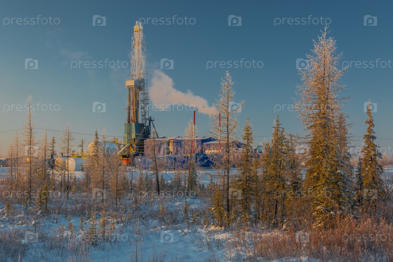 Бурение нефтяных и газовых скважин на северном месторождении. Полярный морозный день. Зимний лесотундровый пейзаж в снегу с буровой установкой. Красивое небо