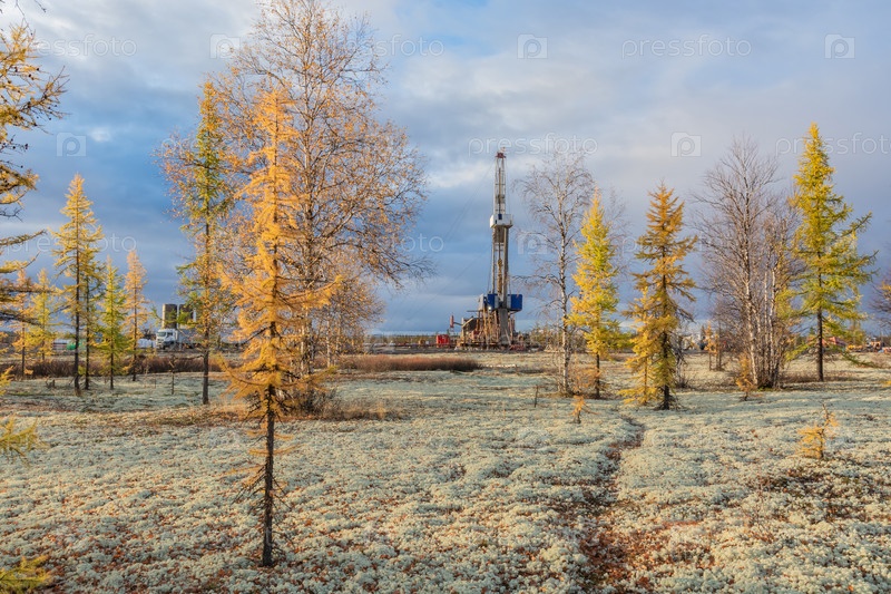 Северная тайга осенью. Золотисто-желтая палитра. Пейзаж на месторождении нефти и газа. Буровая установка стоит между деревьями как центральный элемент композиции