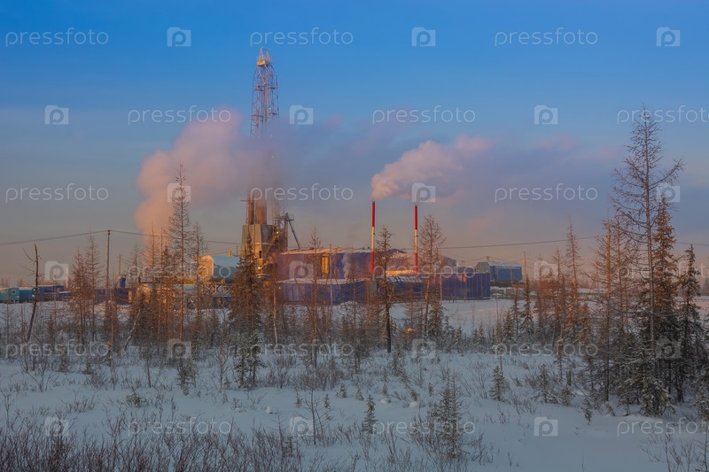 Буровая установка для бурения нефтяных и газовых скважин в северном ландшафте лесотундры. Восходящее зимнее солнце окрашивает пейзаж в оранжевый цвет. Клубы пара и дыма частично закрывают нефтяную вышку