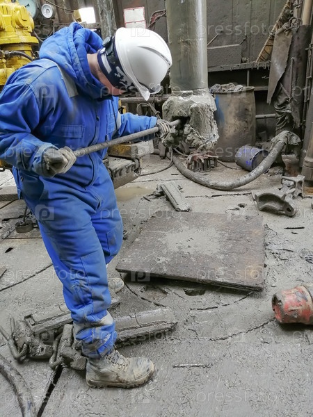 Специалист по буровым долотам осматривает состояние долота, извлеченного из нефтяной и газовой скважины. Инженер одет в синий комбинезон и белую каску