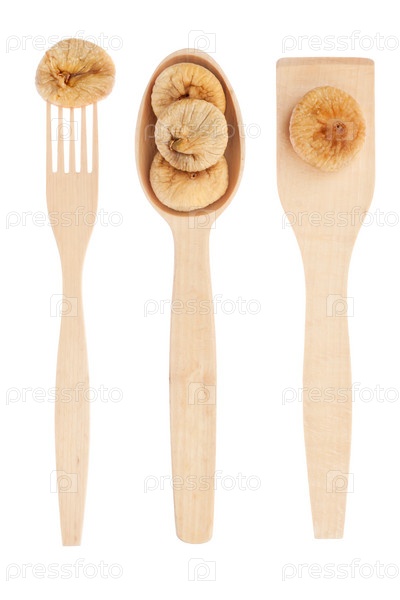 Деревянная ложка, вилка, лопатка с инжиром, выделенные на белом фоне
