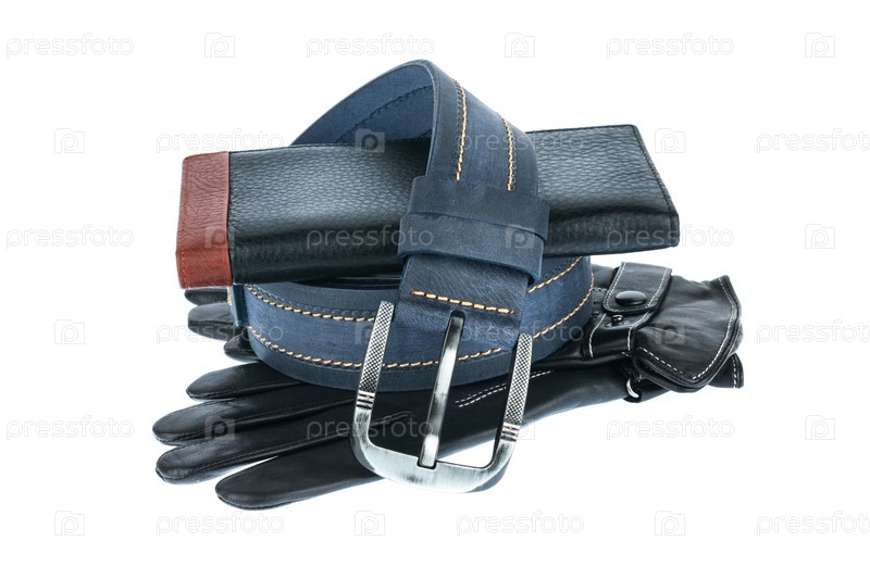 Мужской кошелек, пояс и перчатки, лежащие друг на друге. Выделены на белом фоне. Mens wallet, belt and gloves lying on top of each other. Isolated