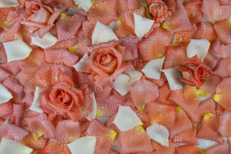 Розы, лежащие на листьях в капле росы. На фоне цветов. Вид сверху. Розы, лежащие на лепестках в каплях росы. Цветы background