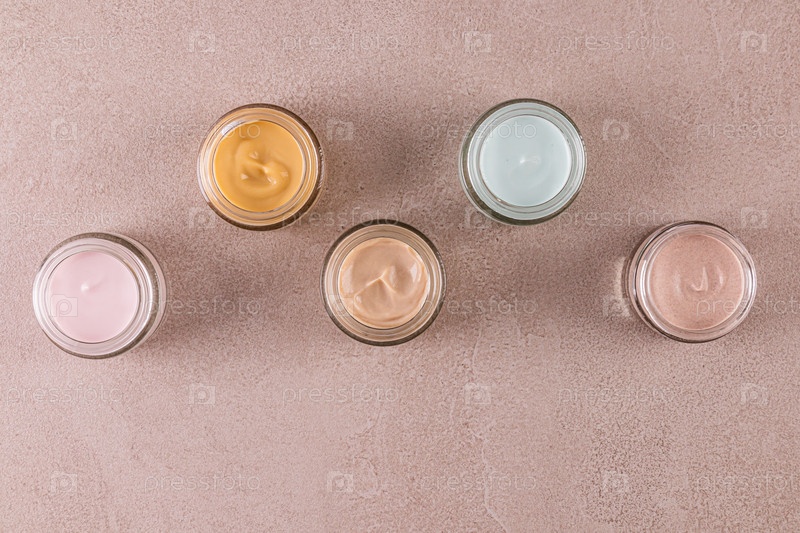 Набор стеклянных баночек с косметическим кремом разных цветов для ухода за кожей лица и тела. Дизайн. упаковка. Презентация продукта. Вид сверху. макет