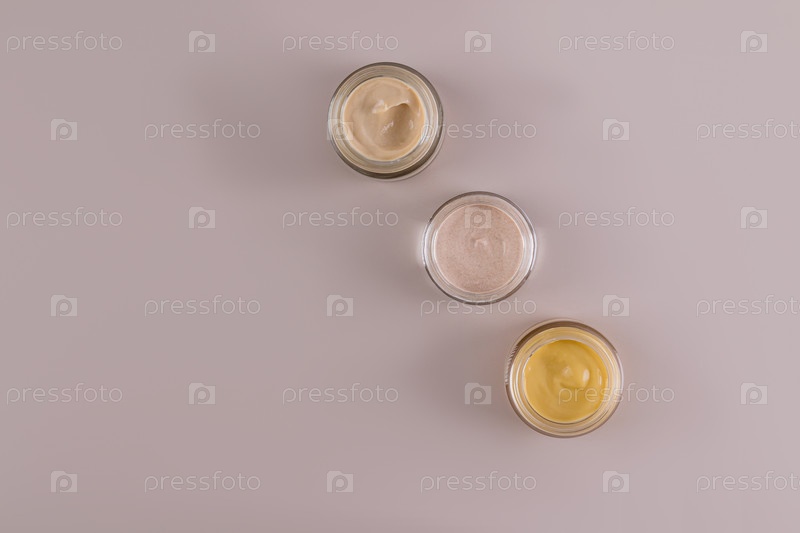 Набор стеклянных баночек с косметическим кремом разных цветов для ухода за кожей лица и тела. Дизайн. упаковка. Презентация продукта. Вид сверху. макет
