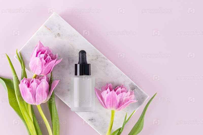 Косметический продукт, масло, сыворотка для ухода за кожей лица и тела в матовой бутылке с капельницей лежат на мраморном подиуме с нежными тюльпанами. Вид сверху