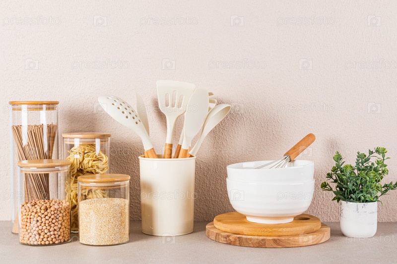 Красивый кухонный фон с местом для хранения сыпучих продуктов, ложками и кухонными принадлежностями и зеленым растением в горшке. Передний план