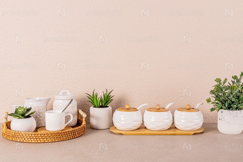 Белый керамический чайный сервиз на круглом плетеном подносе среди комнатных растений на кухонной столешнице. Кухня фон в светлых тонах. Копировальное пространство. Передний план