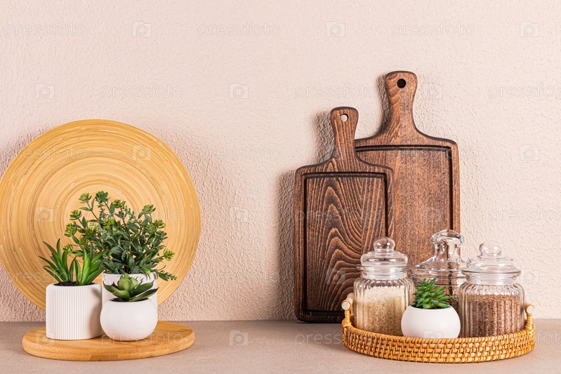 Набор стеклянных банок со специями на круглом плетеном подносе на каменной столешнице. Комнатные растения в горшках. Кухонный фон. Передний план