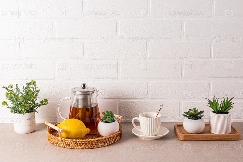 Предметы чайной церемонии, установленные на кухонной каменной столешнице с горшечными растениями на стене из белого кирпича. Копировальное пространство. Кухня фон