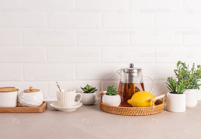 Красивый кухонный фон со стеклянным чайником ароматного чая, чашкой, лимоном на плетеном подносе. Передний план. Стена из белого кирпича. Место для копирования