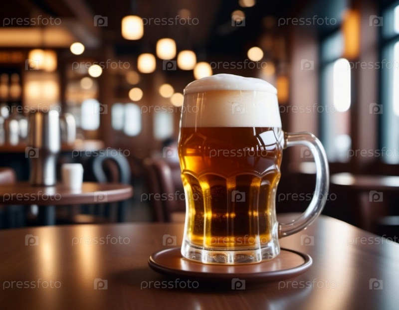 Пивная стеклянная кружка с ручкой со светло-желтым пивом с пеной. Пиво на столе в кафе, эффект боке, фото с наклоном и сдвигом. Картинка для рекламы алкогольных напитков. Пивной паб