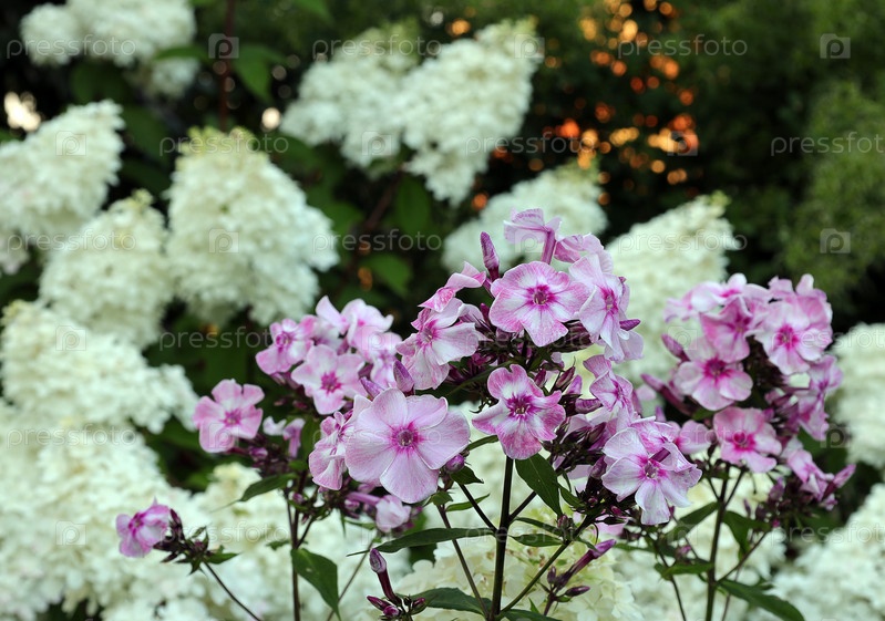 Розовый флокс на фоне белых гортензий и заходящего солнца