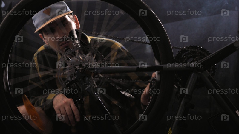 Мужчина в бейсболке и рубашке ремонтирует велосипед в мастерской. Велосервис, спортивный магазин. Механик использует специальный инструмент для регулировки велосипеда