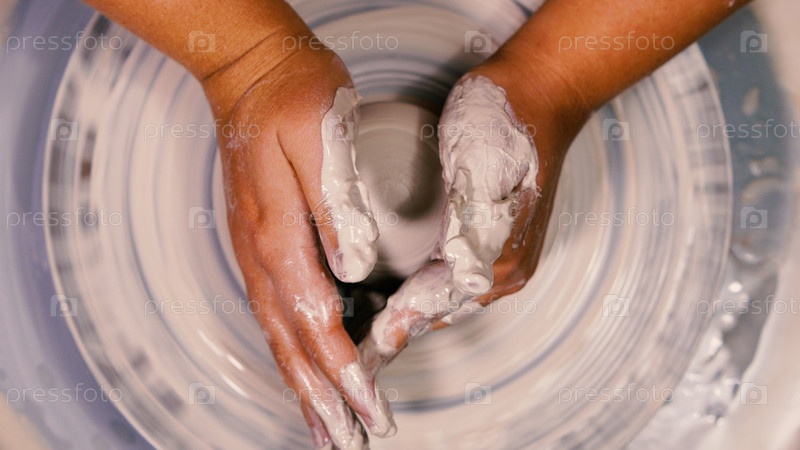 Работа окрашенных рук женщины-гончара, лепящей на круге белый глиняный горшок. Гончар демонстрирует искусство ремесла. Понятие ручной работы, искусства и ремесла