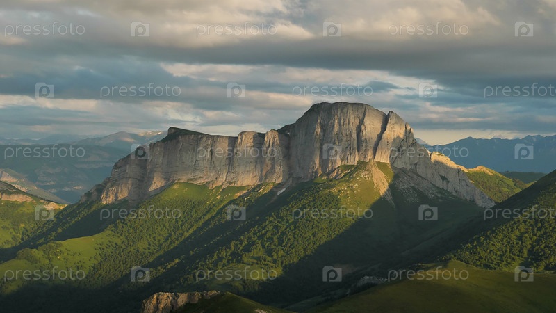 Мощные величественные скалы. Дождевые облака нависли над горами. Красивый вечерний свет. Гора Чертовые ворота или Ачешбок
