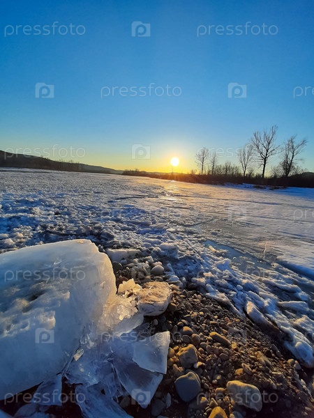 Ледоход на реке. Лед в движении ранней весной. Плавание льда весной. Весенний лед дрейфует по реке
