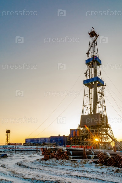 Буровая установка на нефтегазовом месторождении в Арктике. Утро полярного зимнего дня. Солнечное боке у устья скважины. Задний свет. Бурильные трубы на переднем плане