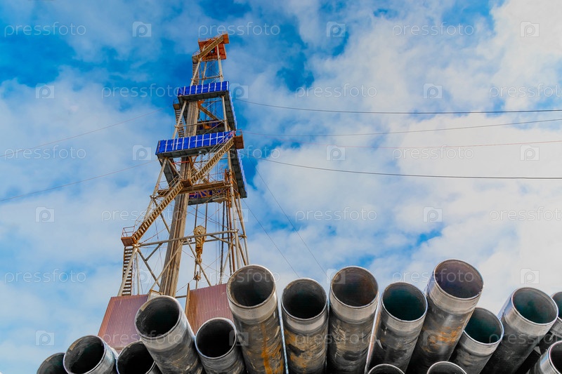 На переднем плане трубы для бурения нефтяных и газовых скважин. На заднем плане буровая установка. Голубое небо с облаками