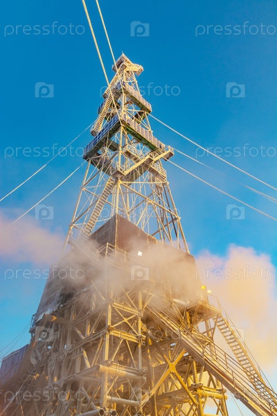 Бурение на северном нефтегазовом месторождении зимой. Буровая установка покрыта снегом и освещена солнцем в полярный день. Паровые завихрения для обогрева буровой установки