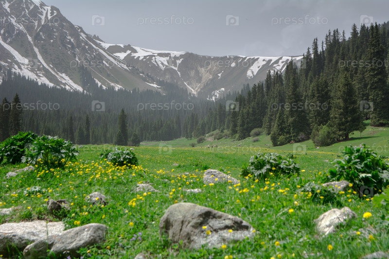 Горные луга и леса в конце ущелья Джети-Огуз, Кыргызстан