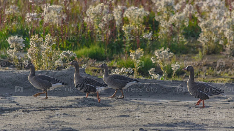 Дикие гуси ищут пищу среди кустов. Размытое изображение растительности тундры на заднем плане