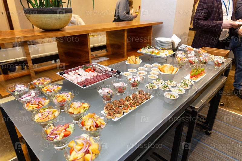 Фуршетный стол с холодными закусками и салатами. Шведский стол, фуршет в ресторане, мини-канапе, закуски и закуски