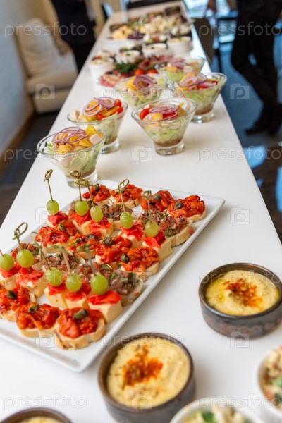 Фуршетный стол с холодными закусками и салатами. Шведский стол, фуршет в ресторане, мини-канапе, закуски и закуски