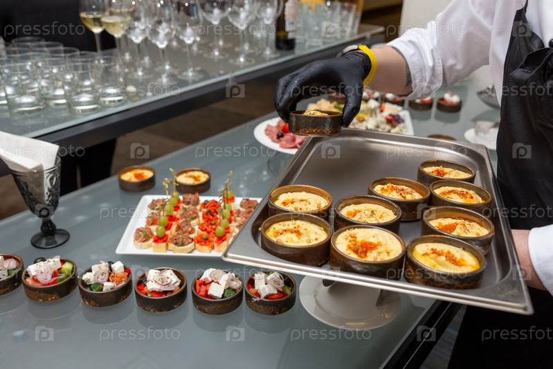 Официант раскладывает закуски на праздничный стол. Шведский стол, фуршет в ресторане, мини-канапе, закуски и закуски