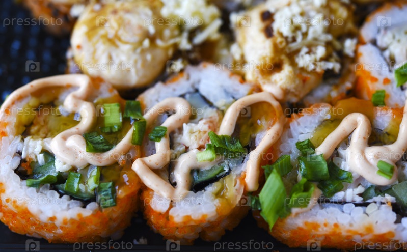 Рыбные рулетики с соусом. Японские суши-роллы. Рисовый завтрак из роллов