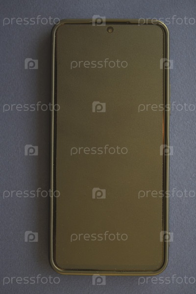 Черный смартфон на синем фоне. Новый гаджет. Смартфон с защитной пленкой и чехлом