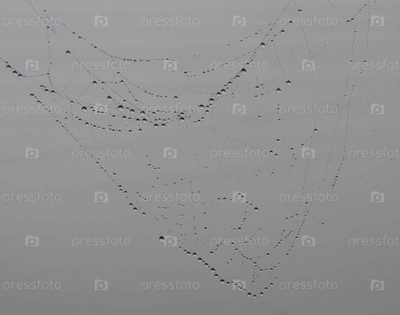 Паутина с каплями воды утром на озере летом