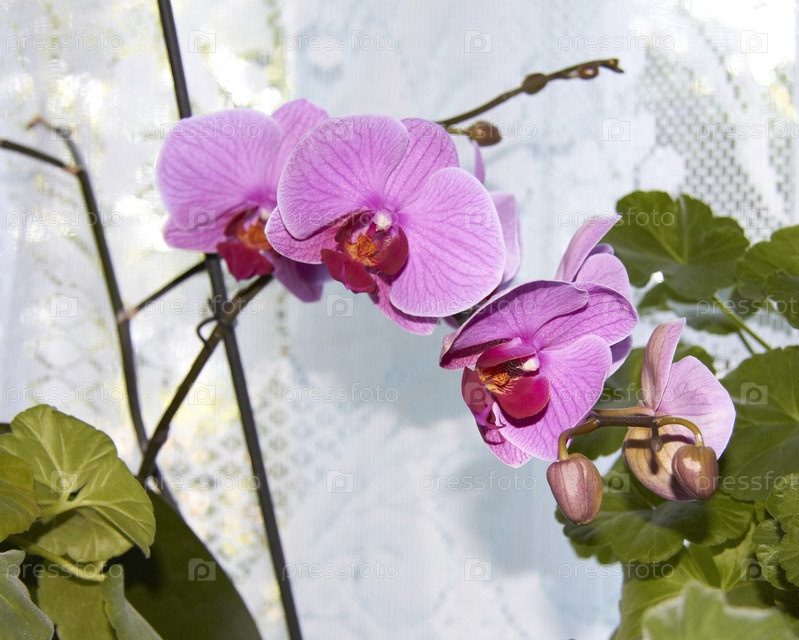 Красивая розовая орхидея на фоне белой кружевной занавески летом