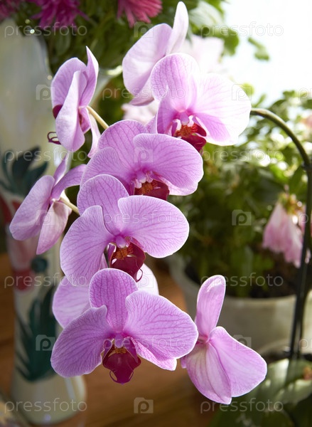 Красивая розовая орхидея на фоне белой кружевной занавески летом