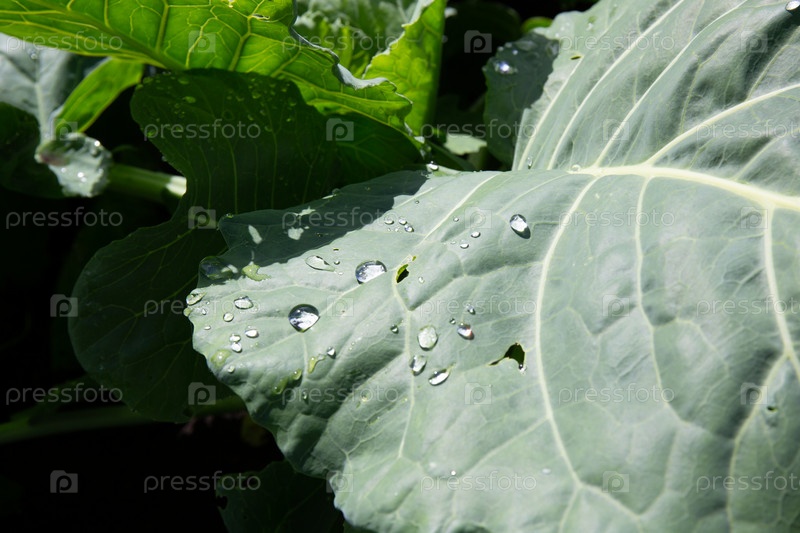 Капли воды на листе капусты после дождя в саду