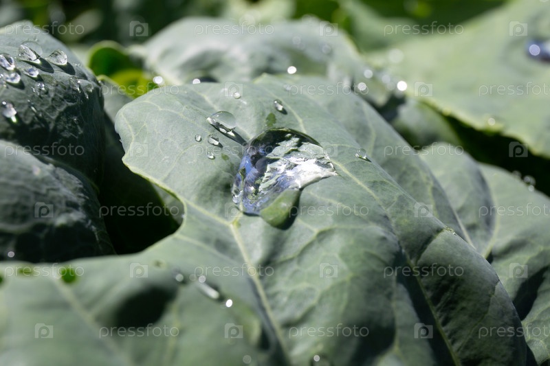 Капли воды на листе капусты после дождя в саду
