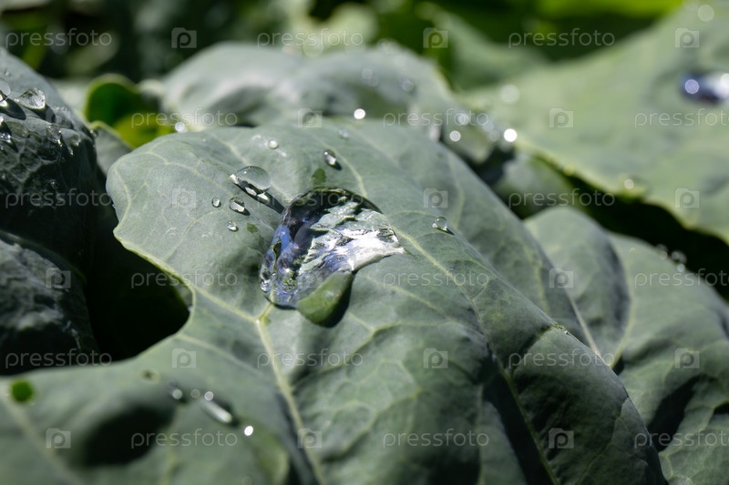 Капли воды на листе капусты после дождя в саду