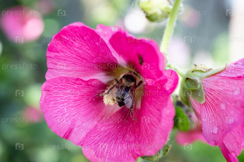 Медоносная пчела на розовом цветке мальвы в саду летом