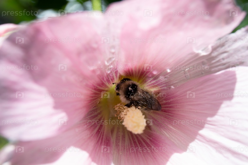 Медоносная пчела на розовом цветке мальвы в саду летом