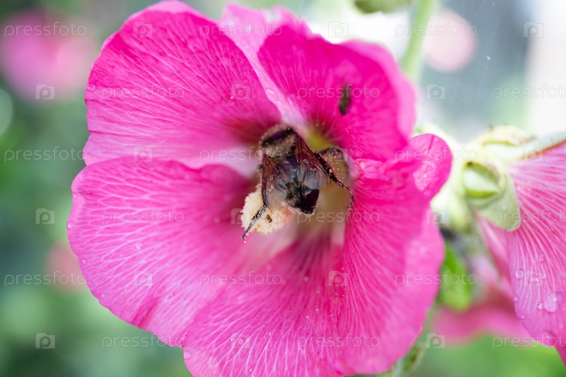 Медоносная пчела на розовом цветке мальвы в саду летом