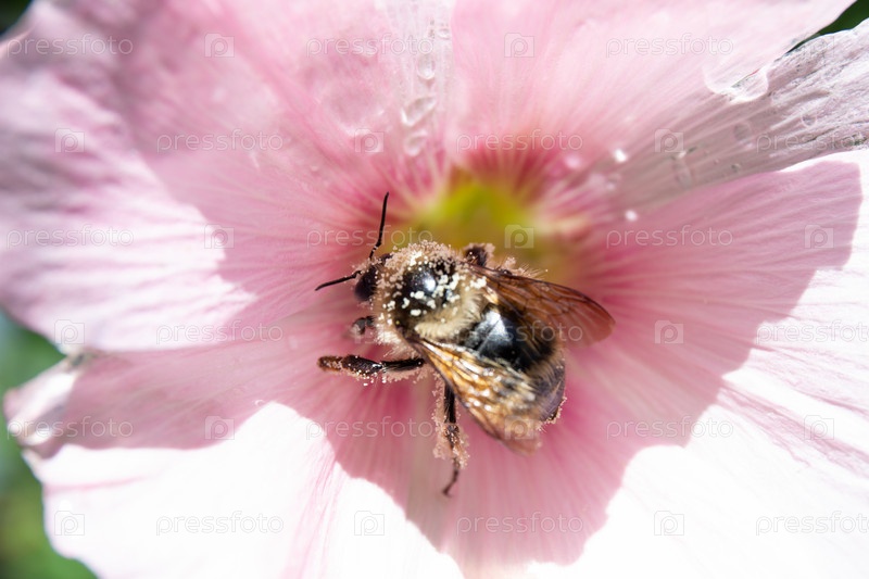 Медоносная пчела на розовом цветке мальвы в саду летом