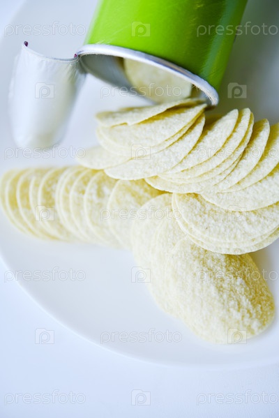 Картофельные чипсы в блюдце на белом фоне. Они высыпают чипсы из коробки. Вкусная закуска