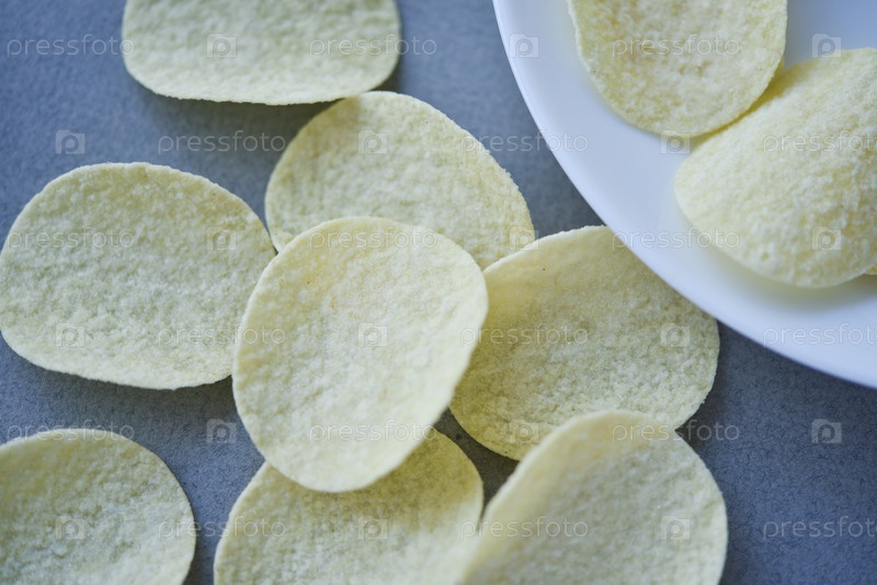 Картофельные чипсы на сером фоне. Высыпьте чипсы в блюдце. Вкусная закуска