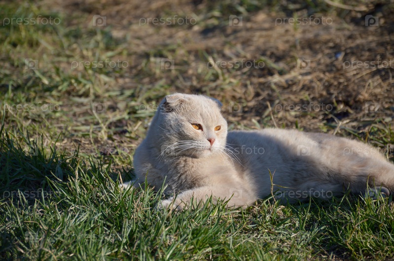 Портрет кота на природе. Кот лежит в траве и отдыхает на свежем воздухе солнечным летним утром
